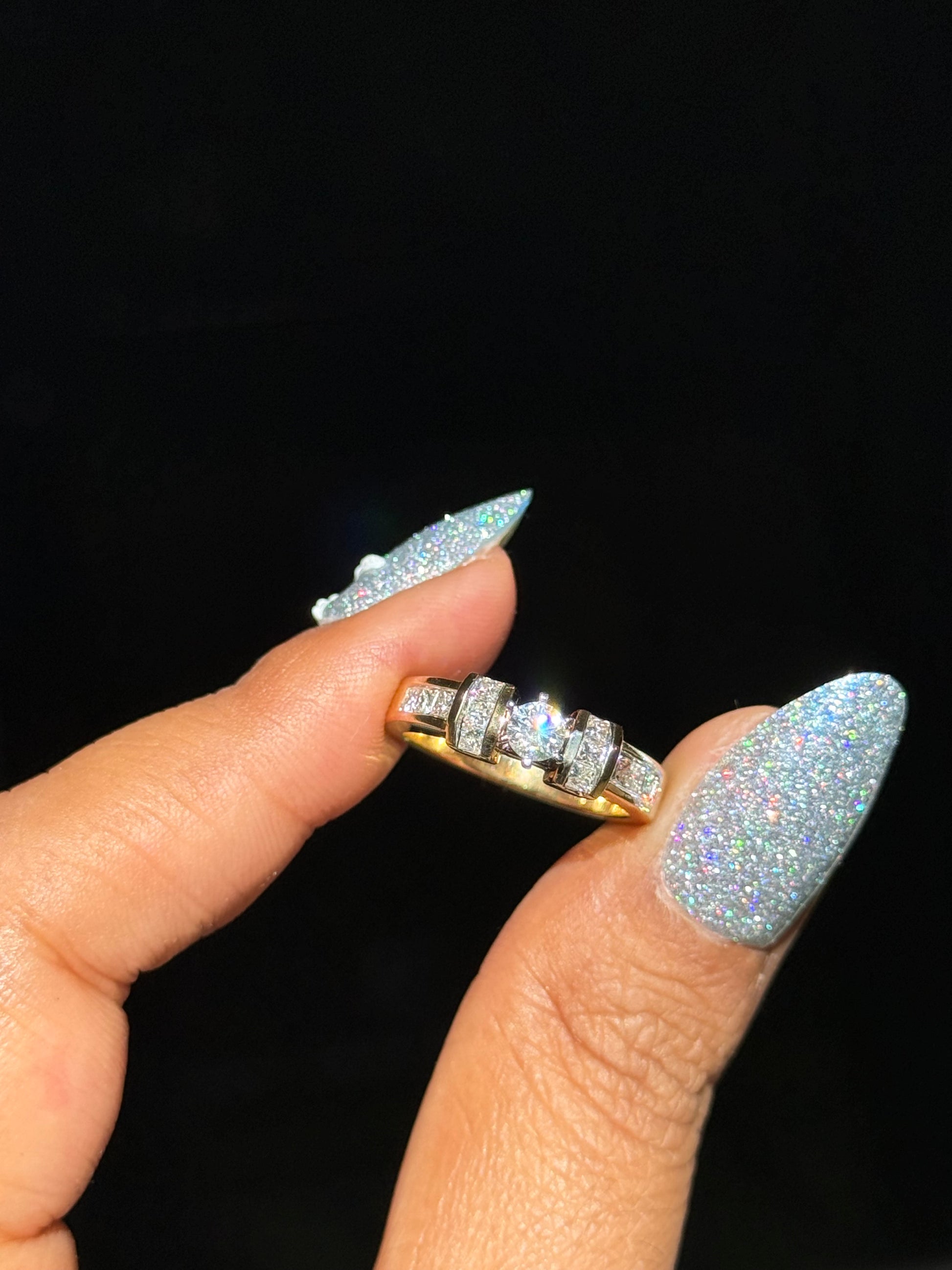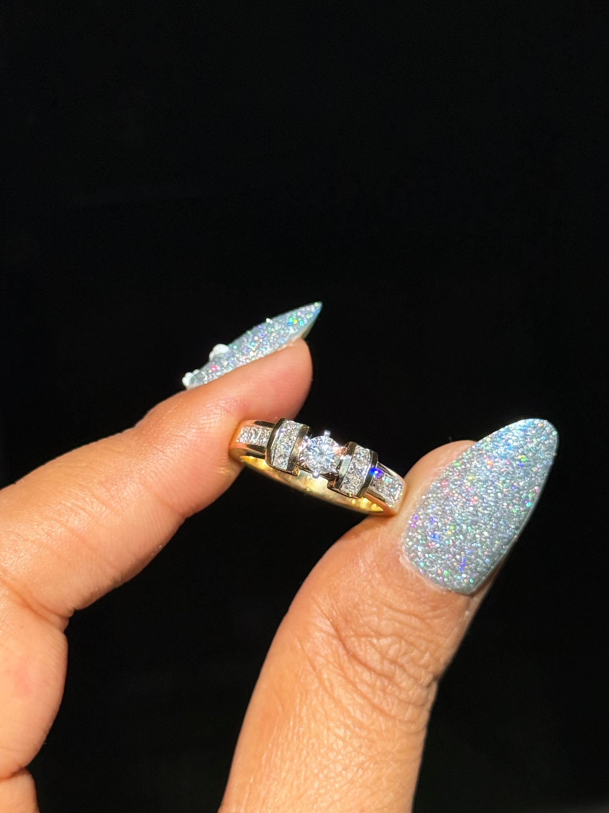 14k yellow gold solid solitaire ring, features approx 0.70ct, with 0.25ct center stone,Sz 7.25 ( sizable)